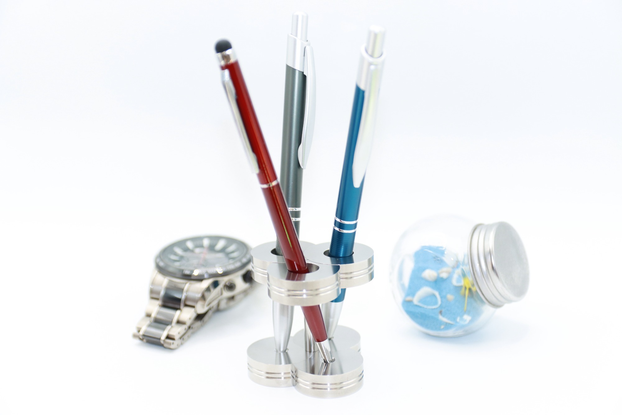高精度の金属加工から生まれるステンレス製の3本ペンスタンドです。