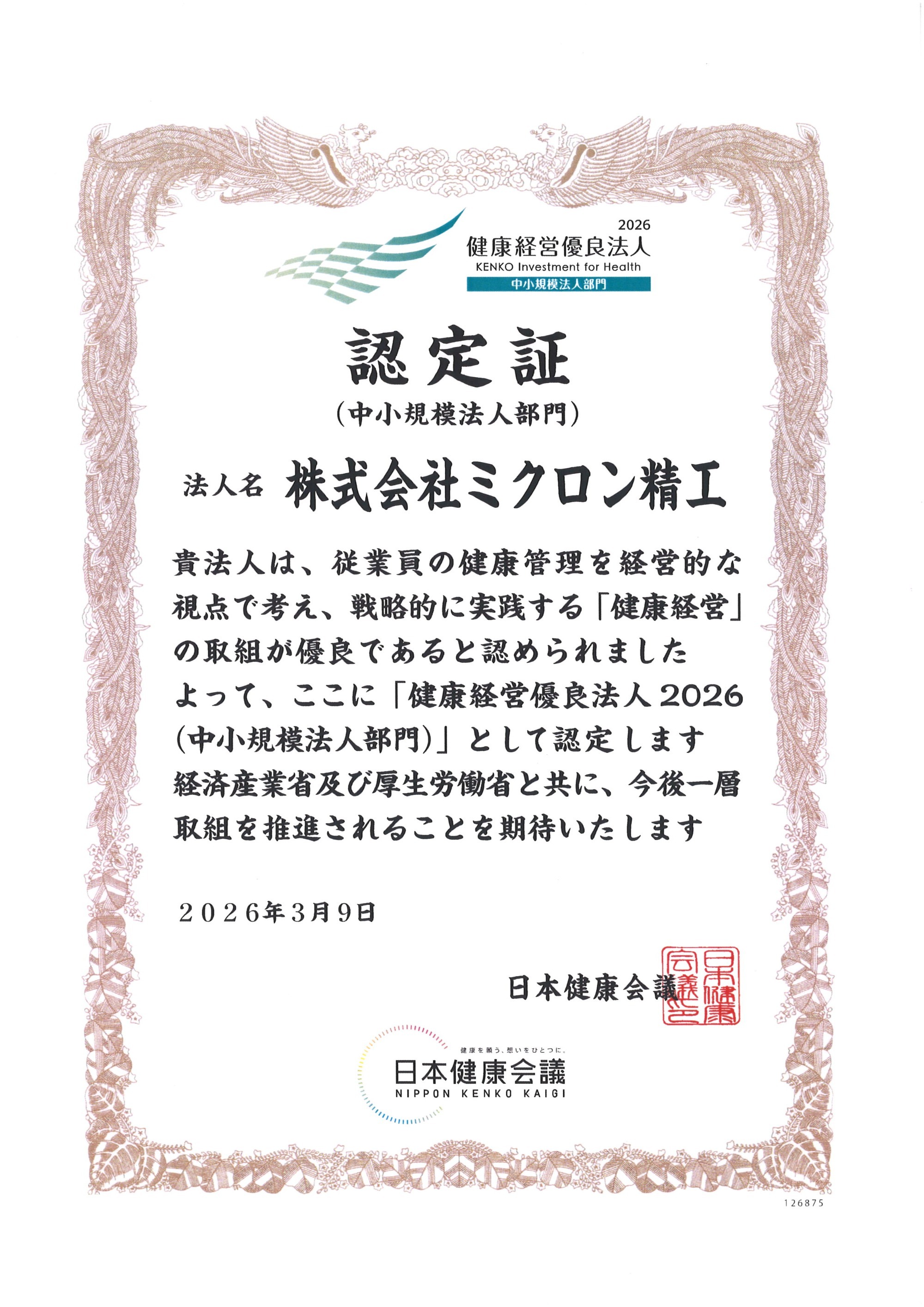 この度、健康経営優良法人2026(中小規模法人部門)に認定されました。
